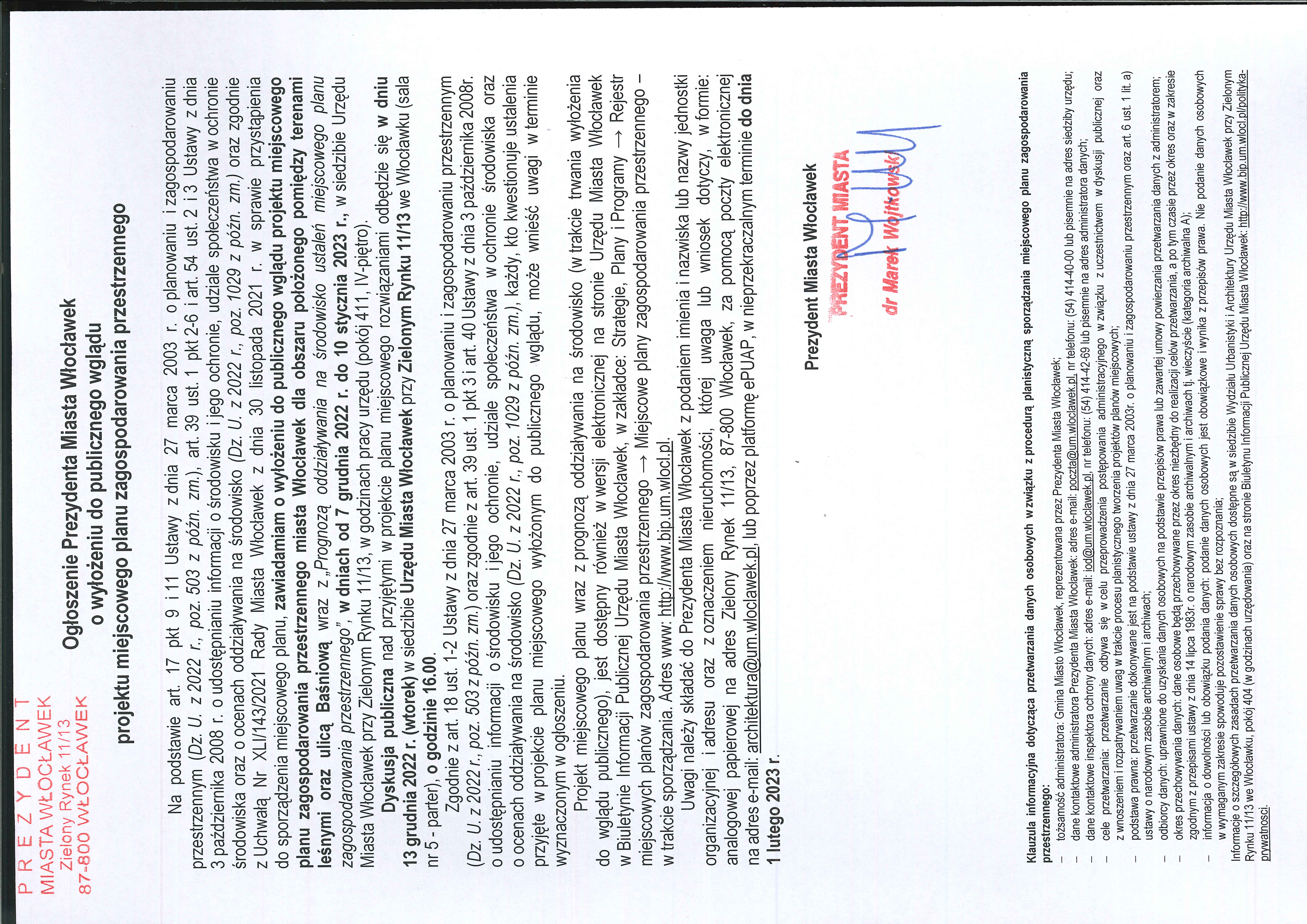 Na podstawie art. 17 pkt 9 i 11 Ustawy z dnia 27 marca 2003 r. o planowaniu i zagospodarowaniu przestrzennym (Dz. U. z 2022 r., poz. 503 z późn. zm.), art. 39 ust. 1 pkt 2-6 i art. 54 ust. 2 i 3 Ustawy z dnia 3 października 2008 r. o udostępnianiu informacji o środowisku i jego ochronie, udziale społeczeństwa w ochronie środowiska oraz o ocenach oddziaływania na środowisko (Dz. U. z 2022 r., poz. 1029 z późn. zm.) oraz zgodnie z Uchwałą Nr XLI/143/2021 Rady Miasta Włocławek z dnia 30 listopada 2021 r. w sprawie przystąpienia do sporządzenia miejscowego planu, zawiadamiam o wyłożeniu do publicznego wglądu projektu miejscowego planu zagospodarowania przestrzennego miasta Włocławek dla obszaru położonego pomiędzy terenami leśnymi oraz ulicą Baśniową wraz z „Prognozą oddziaływania na środowisko ustaleń miejscowego planu zagospodarowania przestrzennego”, w dniach od 7 grudnia 2022 r. do 10 stycznia 2023 r., w siedzibie Urzędu Miasta Włocławek przy Zielonym Rynku 11/13, w godzinach pracy urzędu (pokój 411, IV-piętro).