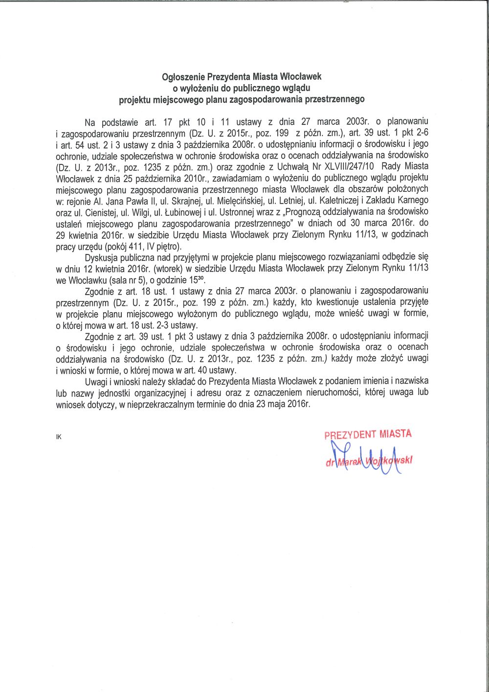 Na podstawie art. 17 pkt 10 i 11 ustawy z dnia 27 marca 2003r. o planowaniu i zagospodarowaniu przestrzennym (Dz. U. z 2015r., poz. 199 z późn. zm.), art. 39 ust. 1 pkt 2-6 i art. 54 ust. 2 i 3 ustawy z dnia 3 października 2008r. o udostępnianiu informacji o środowisku i jego ochronie, udziale społeczeństwa w ochronie środowiska oraz o ocenach oddziaływania na środowisko (Dz. U. z 2013r., poz. 1235 z późn. zm.) oraz zgodnie z Uchwałą Nr XLVIII/247/10 Rady Miasta Włocławek z dnia 25 października 2010r., zawiadamiam o wyłożeniu do publicznego wglądu projektu miejscowego planu zagospodarowania przestrzennego miasta Włocławek dla obszarów położonych w: rejonie Al. Jana Pawła II, ul. Skrajnej, ul. Mielęcińskiej, ul. Letniej, ul. Kaletniczej i Zakładu Karnego oraz ul. Cienistej, ul. Wilgi, ul. Łubinowej i ul. Ustronnej wraz z „Prognozą oddziaływania na środowisko ustaleń miejscowego planu zagospodarowania przestrzennego” w dniach od 30 marca 2016r. do 29 kwietnia 2016r. w siedzibie Urzędu Miasta Włocławek przy Zielonym Rynku 11/13, w godzinach pracy urzędu (pokój 411, IV piętro).